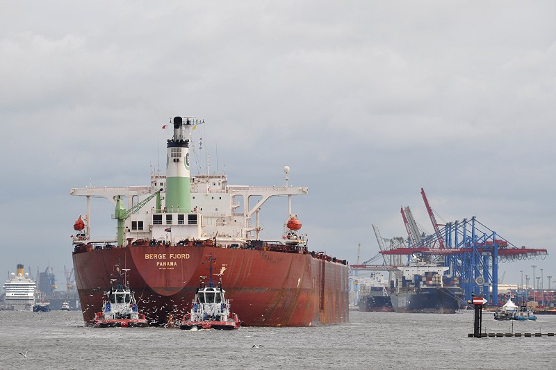 310.698 tdw. Schiff am Tiefwasser-Liegeplatz vor dem Airbus-Werk Finkenwerder (wegen Reparaturen an Rudermaschine). |